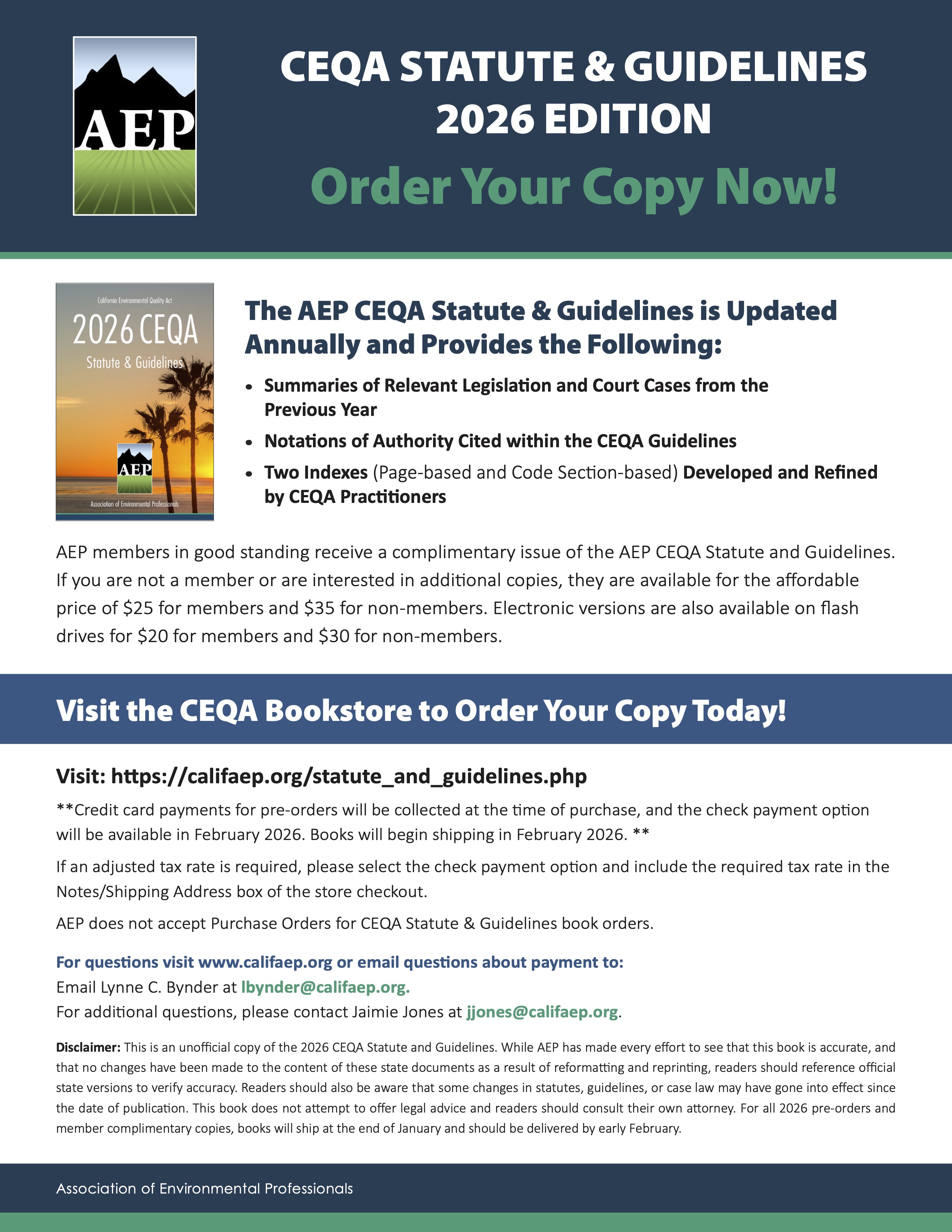 Disclaimer: This is an unofficial copy of the 2026 CEQA Statute and Guidelines. While AEP has made every effort to see that this book is accurate, and that no changes have been made to the content of these state documents as a result of reformatting and reprinting, readers should reference official state versions to verify accuracy. Readers should also be aware that some changes in statutes, guidelines, or case law may have gone into effect since the date of publication. This book does not attempt to offer legal advice and readers should consult their own attorney. For all 2026 pre-orders and member complimentary copies, books will ship at the end of January and should be delivered by early February.